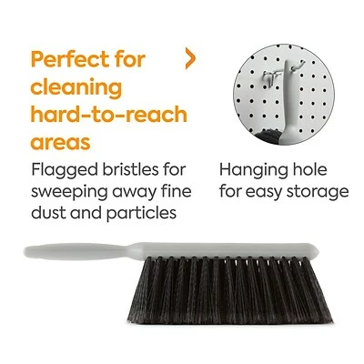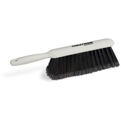 Offer your facility maintenance crew a versatile cleaning tool with this counter brush. The flagged synthetic fibers pick up fine powders effortlessly, and the handheld design offers easy maneuvering. This brush pairs well with a dustpan to manage small messes on floors and counters. Featuring an integrated hole at the end of the handle, this Coastwide Professional gray counter brush hangs neatly on a hook for convenient storage.