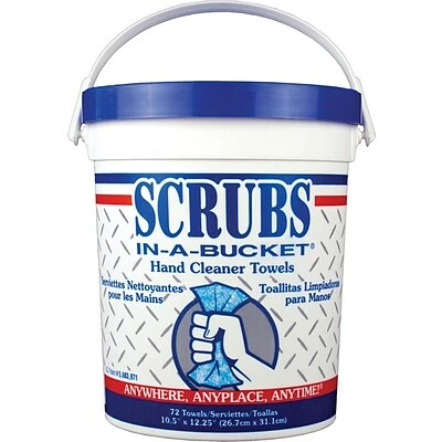 Scrubs Hand cleaner towel bucket removes dirt, oil, grease, tar, adhesive, paint, ink and more. Towel thoroughly cleans hands without water and offer the effectiveness of pumice soap away from the sink.