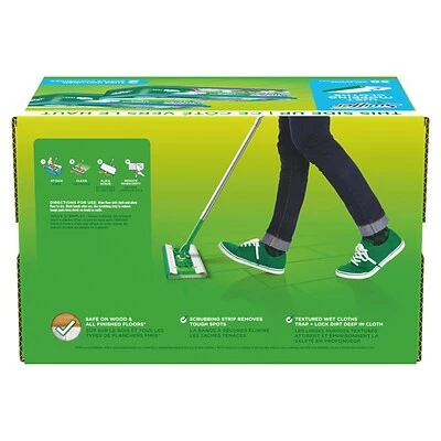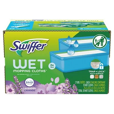 The Swiffer TRAP + LOCK wet mop textured cloth traps and locks dirt deep inside. The cloth is safe to use on all finished floors and has a scrubbing strip to remove tough spots. Do not use on unfinished, oiled, or waxed wooden boards, non-sealed tiles, or carpeted floors because they may be water-sensitive.