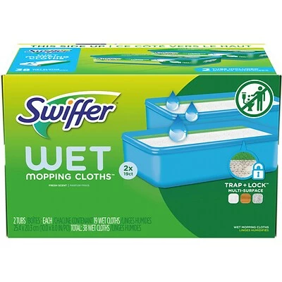 The Swiffer TRAP + LOCK wet mop textured cloth traps and locks dirt deep inside. The cloth is safe to use on all finished floors and has a scrubbing strip to remove tough spots. Do not use on unfinished, oiled, or waxed wooden boards, non-sealed tiles, or carpeted floors because they may be water-sensitive.